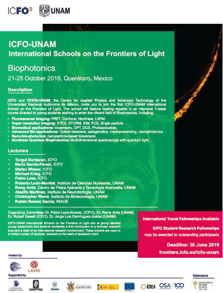 We would like to inform you of a school on Biophotonics for advanced undergraduate and masters students, and beginning PhD students, to be held at Centro de Física Aplicada y Tecnología Avanzada, UNAM Campus Juriquilla, Querétaro, Mexico on 21-25 October 2019.