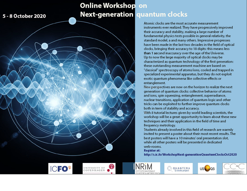 ICFO, among other institutions, organize the Online Workshop on "Next-generation quantum clocks" to be held on line from 5 to 8 of October 2020. Flyer in the attachment. You are invited to participate. There is no registration fee.